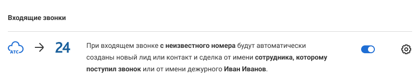 1. Чтобы при новом входящем или исходящем звонке в Битрикс24 автоматически создавался лид или сделка с контактом, нужно включить создание этих сущностей в АТС.