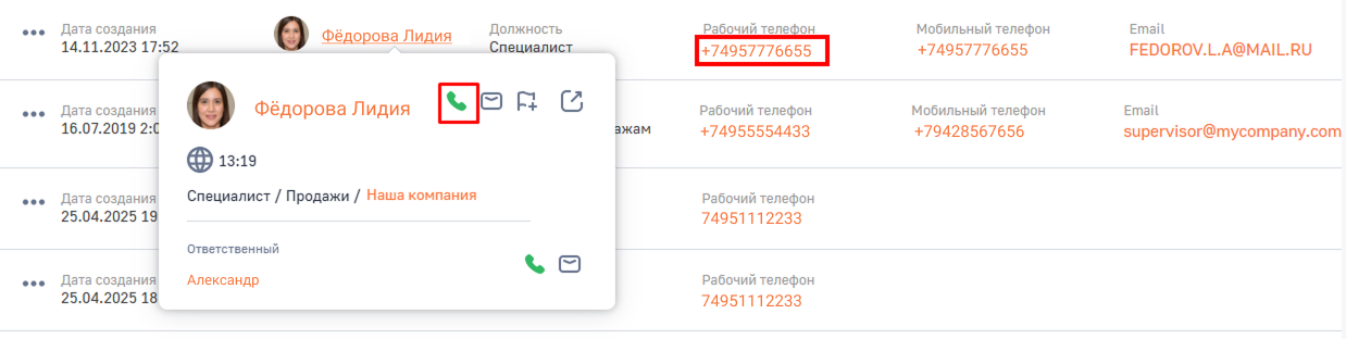 Если сотруднику надо позвонить по ранее сохраненному номеру, он может совершить звонок в один клик из реестра записей или карточки контакта.