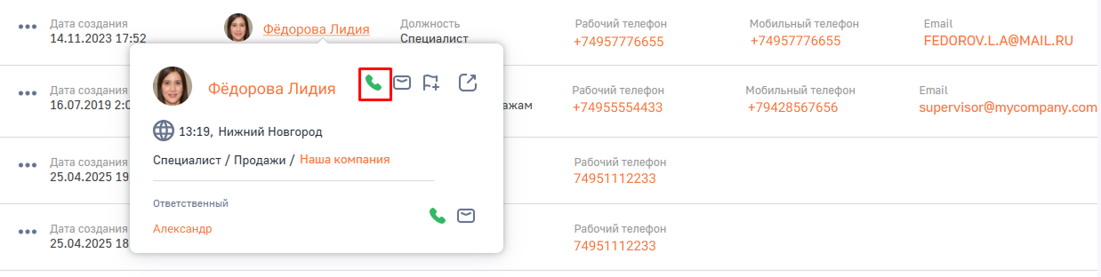 - Звонок ранее сохраненному контакту: нажмите на номер телефона контакта наведите курсор на имя контакта . При появлении карточки контакта нажмите на зеленую трубку.