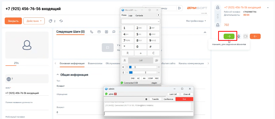 3. Нажмите на кнопку «Сохранить». Теперь вы можете совершать, принимать и переводить звонки в интерфейсе BPMSoft.