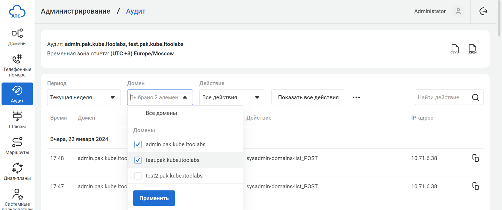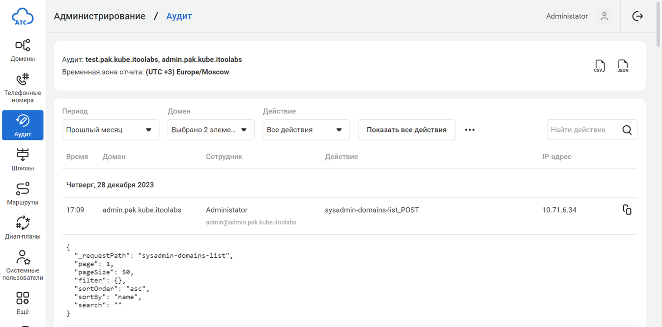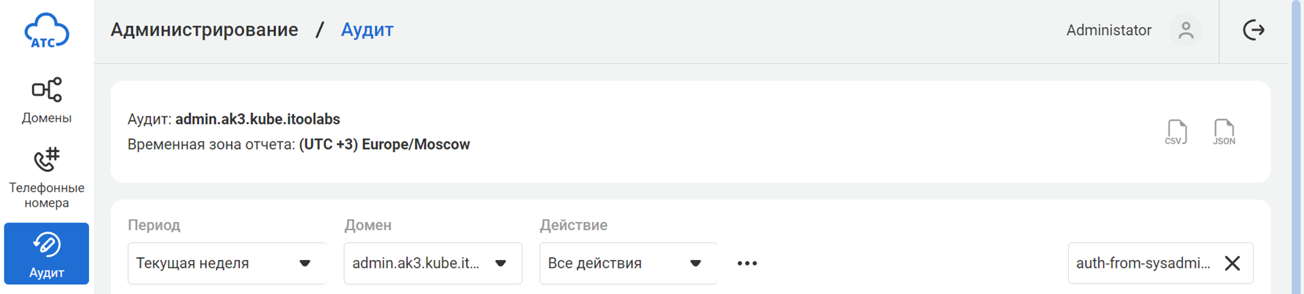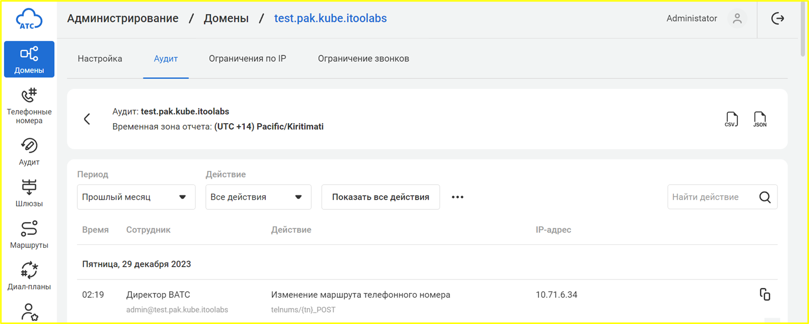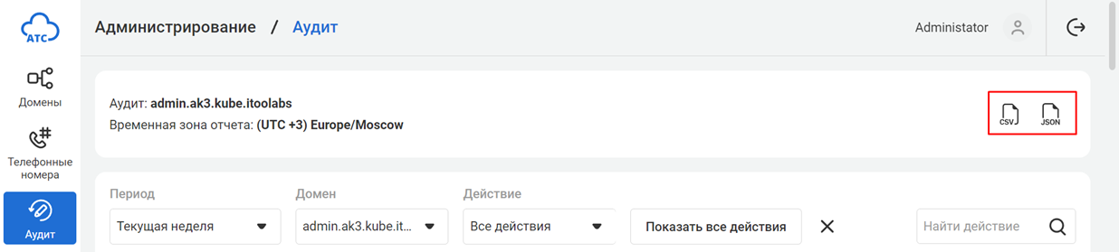 2. Раздел Аудит - здесь отображается история действий по всем доменам. Отфильтровать историю действий по конкретному домену можно с помощью фильтра “Домен”.