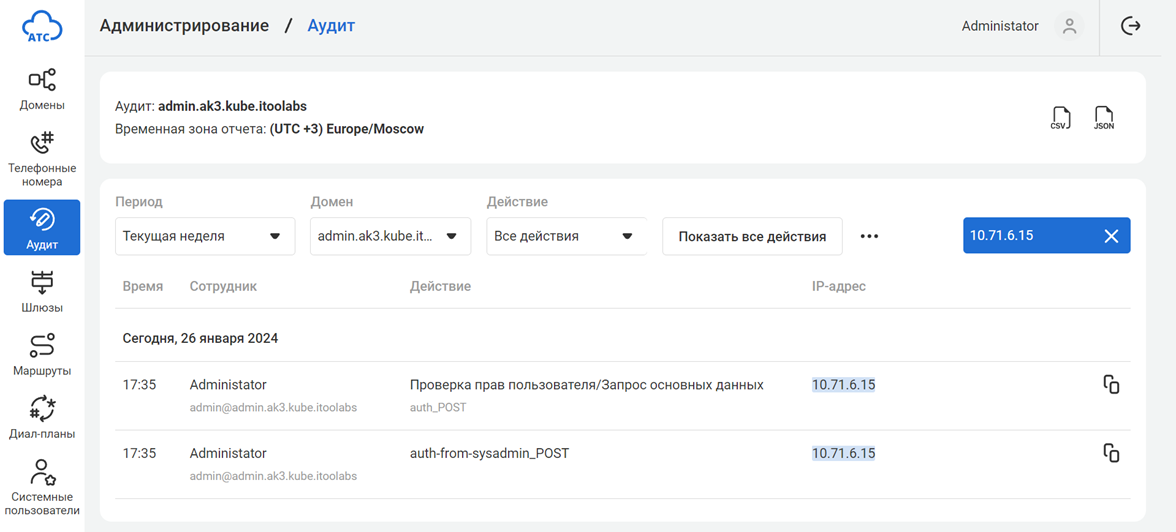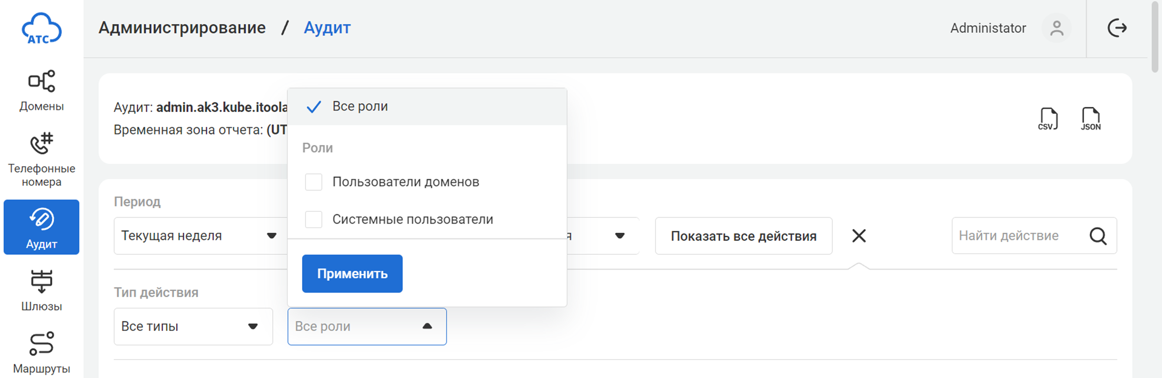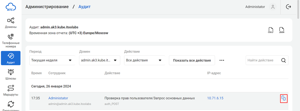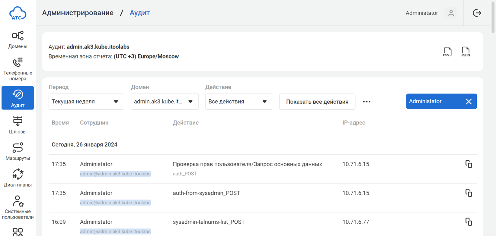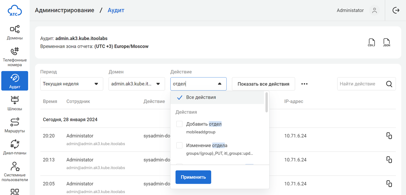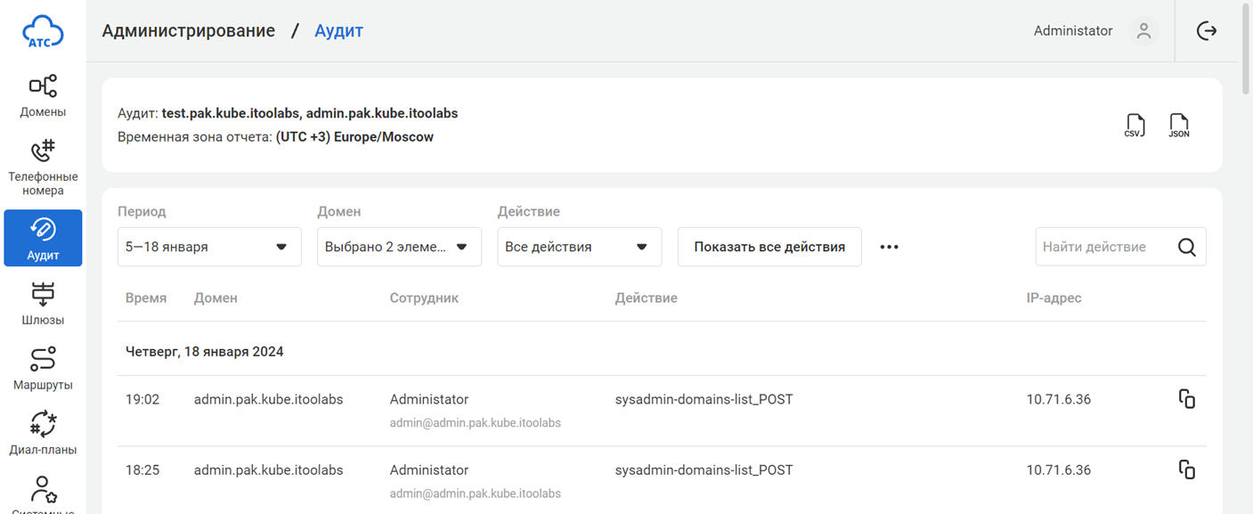 2. Раздел Аудит - здесь отображается история действий по всем доменам. Отфильтровать историю действий по конкретному домену можно с помощью фильтра “Домен”.
