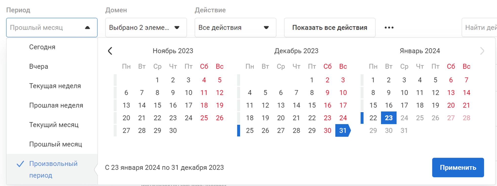 1. Нажмите на фильтр Период. Вы сможете быстро отфильтровать действия за сегодня, вчера, текущую или прошлую неделю, текущий или прошлый месяц, а также выбрать произвольный период. При таком выборе по умолчанию откроется календарь за три последних месяца.