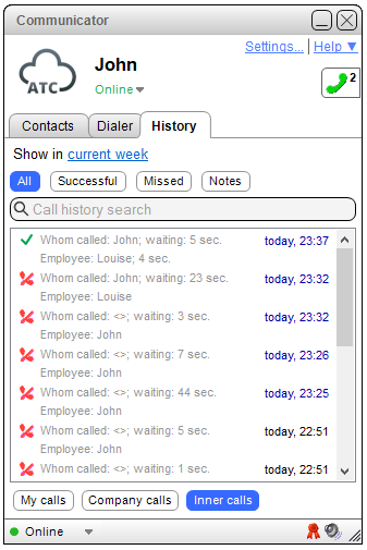 To view the Call History, there's no need to access the cloud PBX. All employee and company calls are accessible within Communicator on the History tab. You can filter calls by period and call type, listen to recordings of any conversation, and make callbacks directly from the Call History.