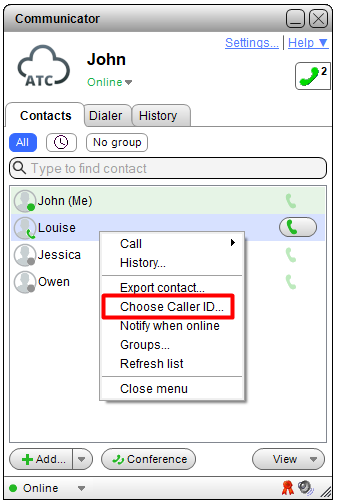 If you want to change the default outgoing number for a specific contact, right-click the desired contact and then left-click Choose Caller ID.
