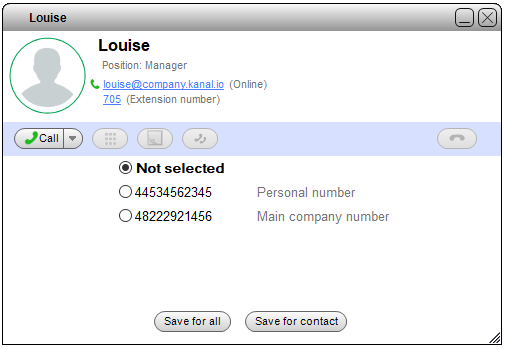 Select the desired outgoing number. If you want to make a one-time call from the selected number, click the Call button in the upper left corner. If you want to call the client from the selected number regularly, first click Save for contact.
