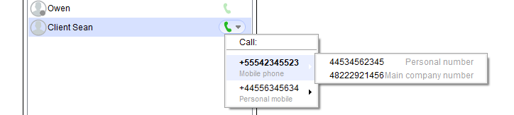 If a client has multiple numbers, click on the green phone icon next to the client's name in the contacts list. Choose the number to call. For example, the client may have a work (office) phone and a mobile phone.