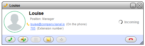 During an incoming call, you will hear a distinct sound signal and a pop-up call window will appear at the top of the Communicator screen. In this window, you can easily answer the call with just one click.