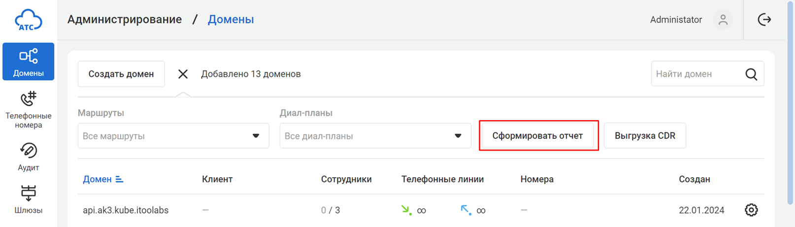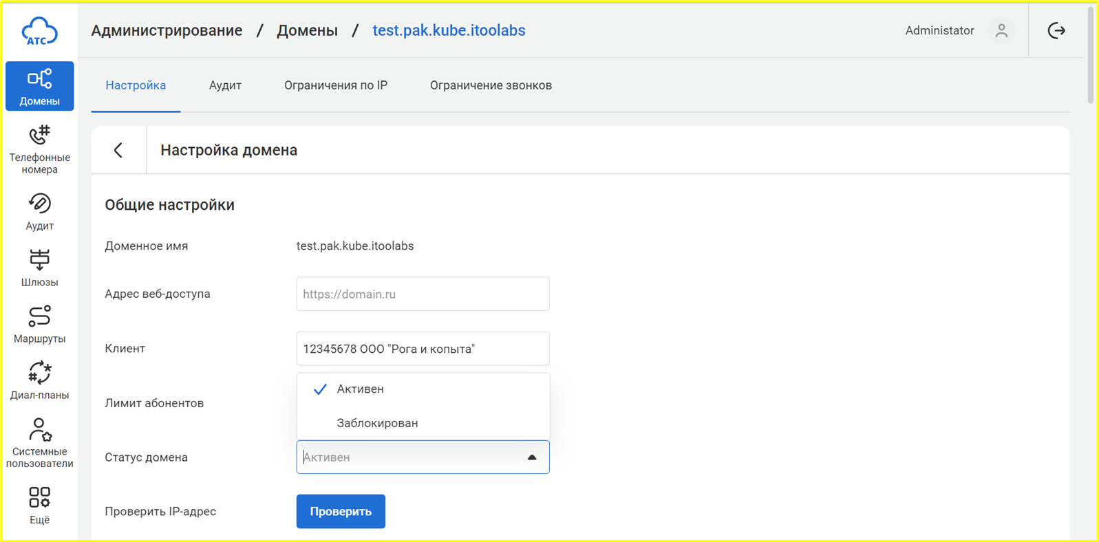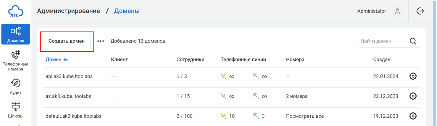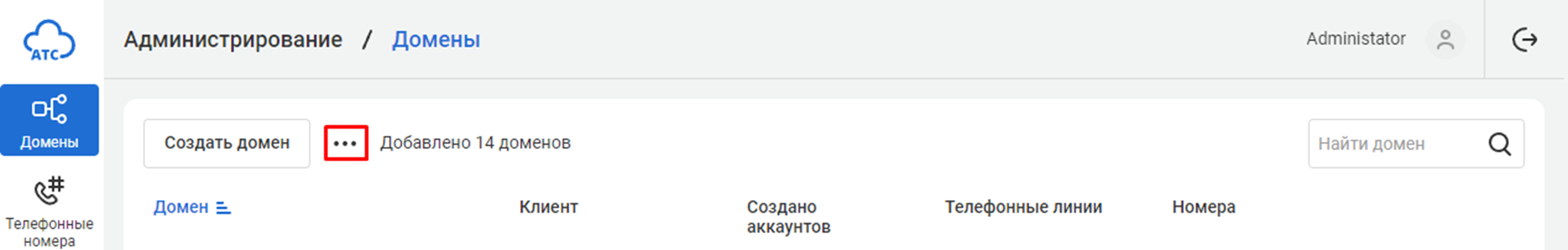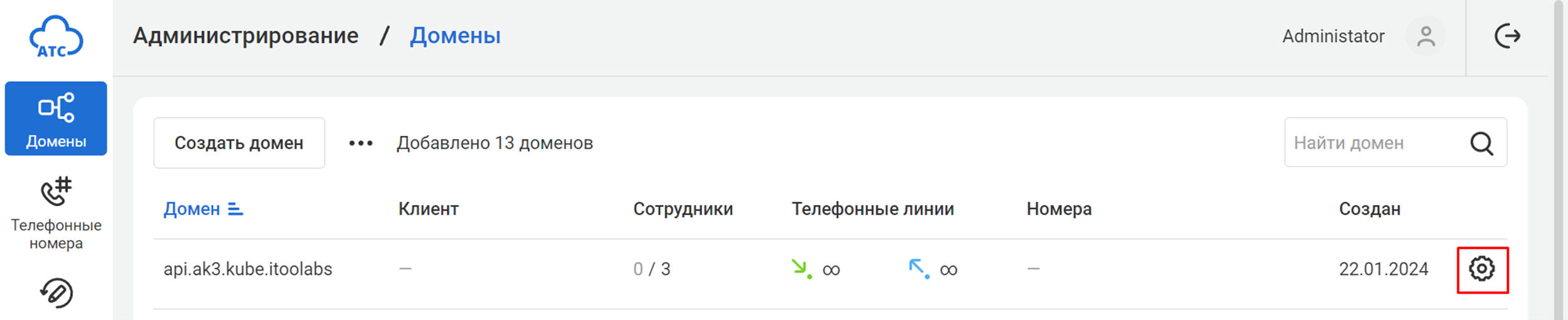 1. Нажмите на название домена, в клиентский интерфейс которого нужно перейти. 2. Откроется клиентский интерфейс для настройки АТС.