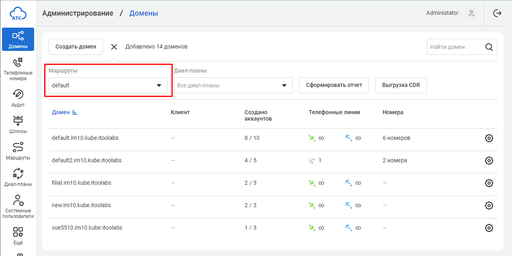 2. В фильтрах Маршруты и Диалпланы выберите нужное значение. В списке отобразятся только домены, связанные с выбранными маршрутом и диалпланом.