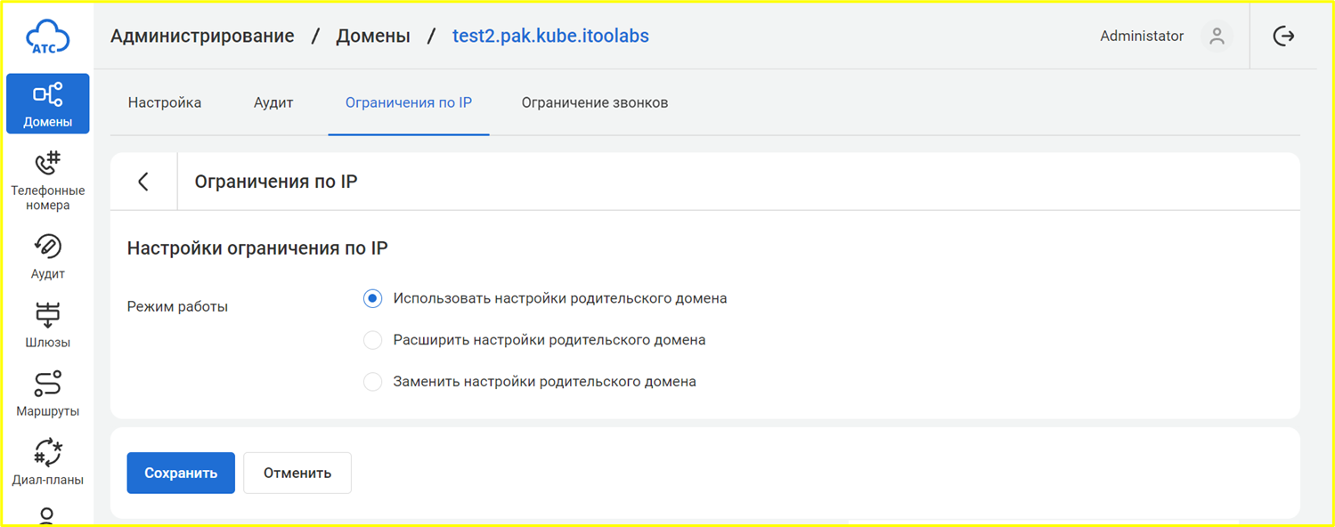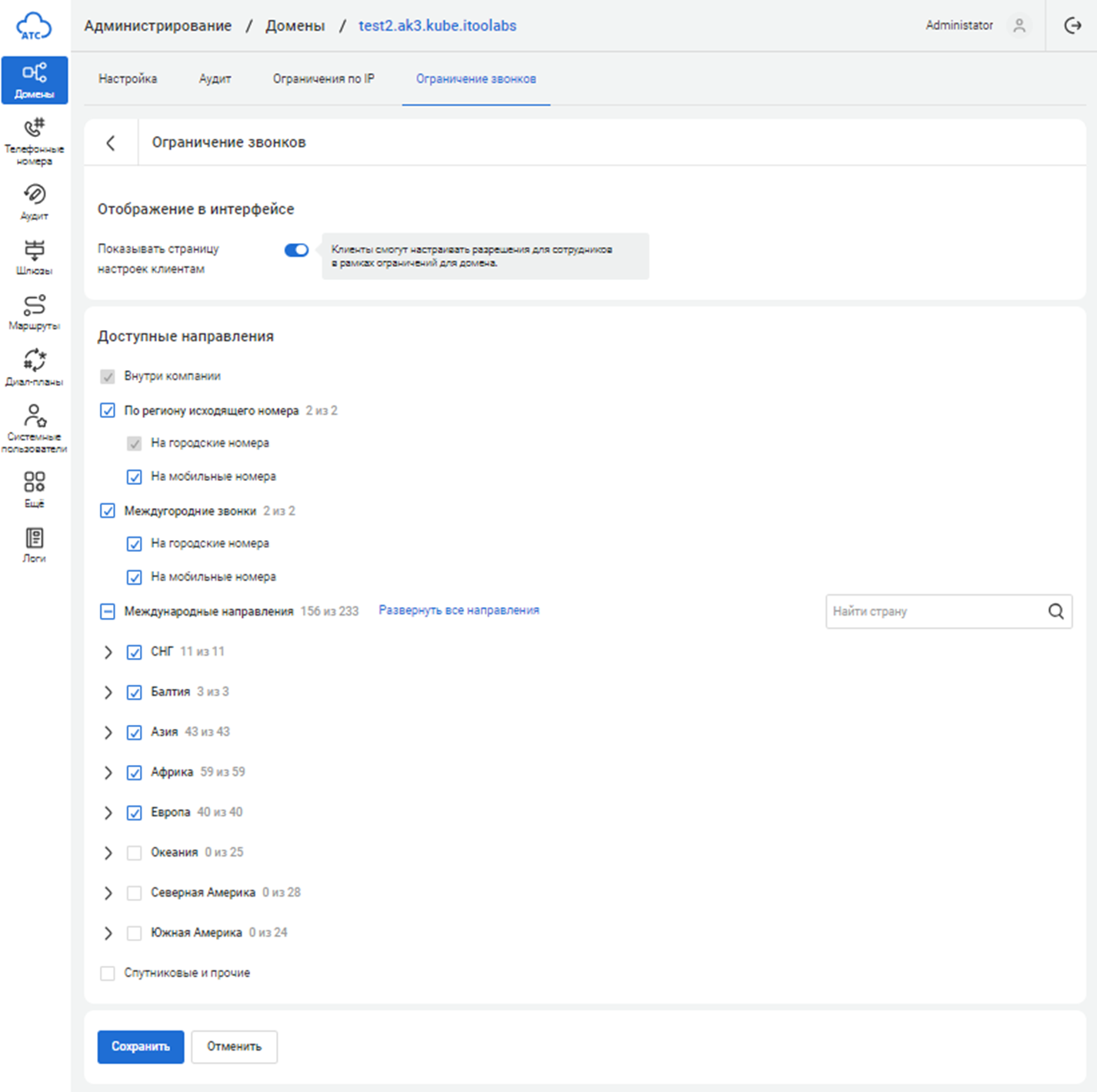 На этой же вкладке можно полностью скрыть раздел Ограничение звонков в клиентском интерфейсе. В таком случае ограничения направлений звонков для конкретного домена будут полностью контролироваться из интерфейса.