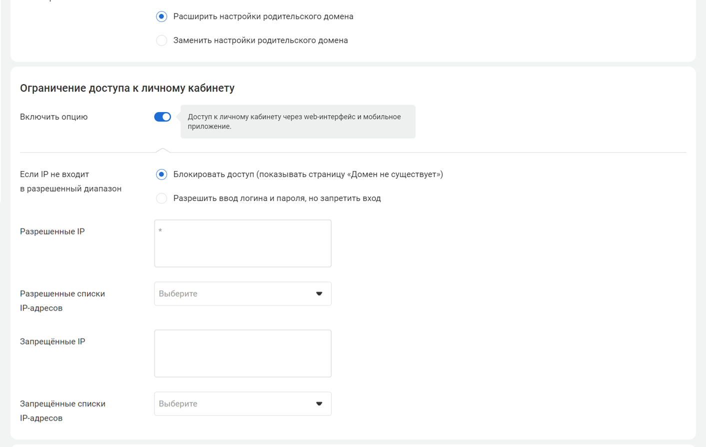 - Если IP не входит в разрешенный диапазон — действует правило, если вход выполняется с запрещенного IP-адреса. Возможные варианты: Блокировать доступ (показывать страницу «Домен не существует») или Параметры ввода логина и пароля.