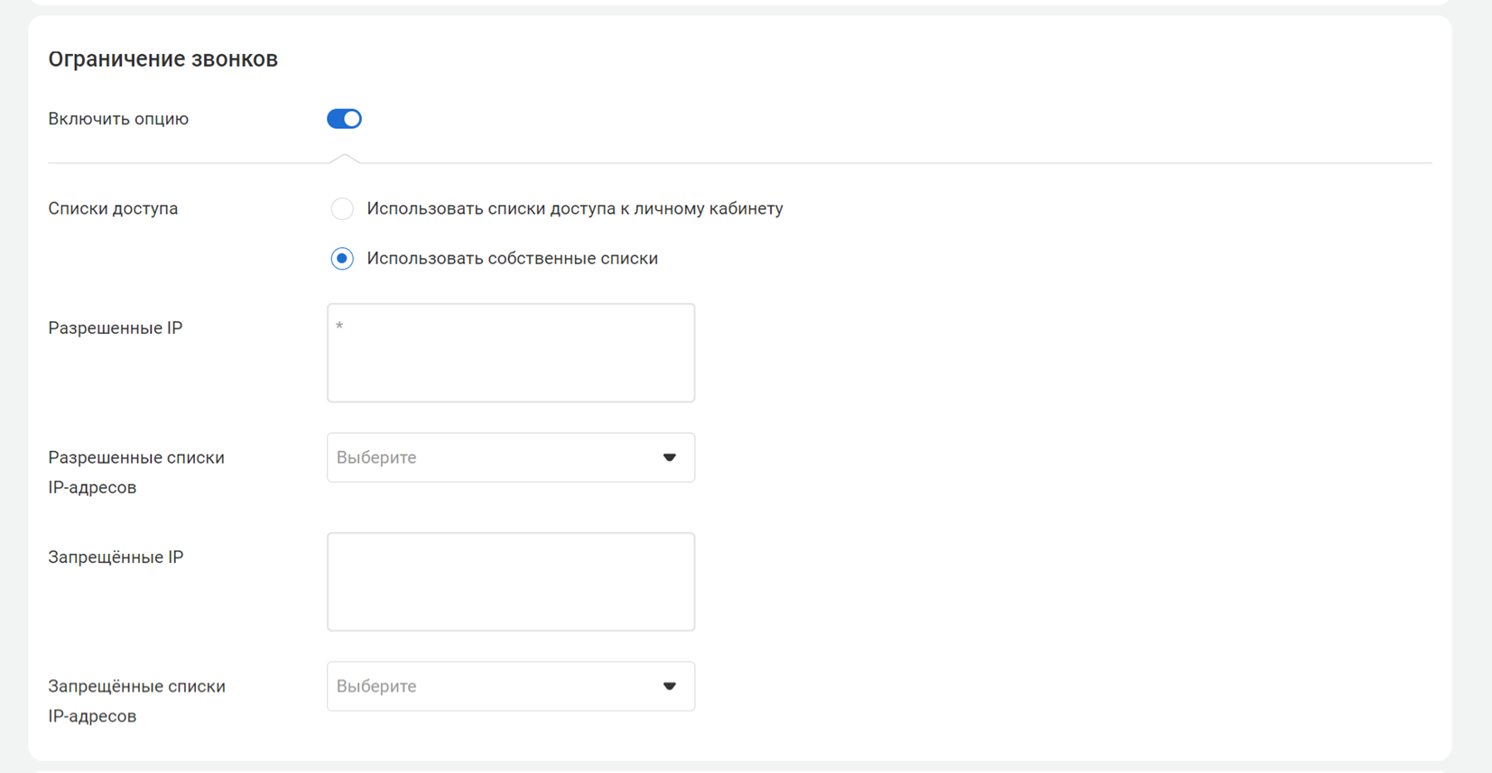 Вкладка Ограничения по IP позволяет задать IP-адреса, с которых возможен вход в клиентский интерфейс и совершение вызовов. Например, для того чтобы сотрудники могли осуществлять вызовы из офиса, но не могли делать этого удаленно.
