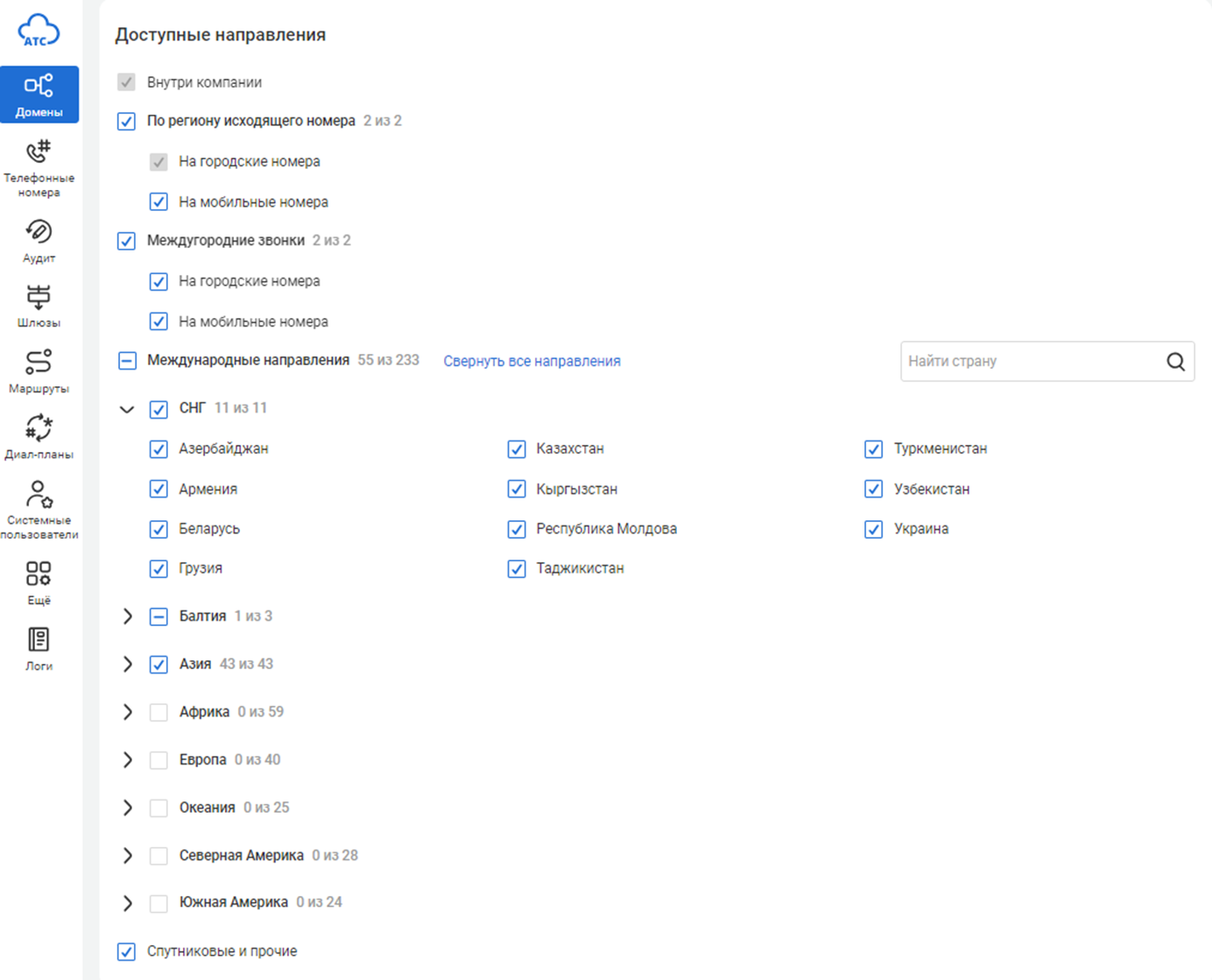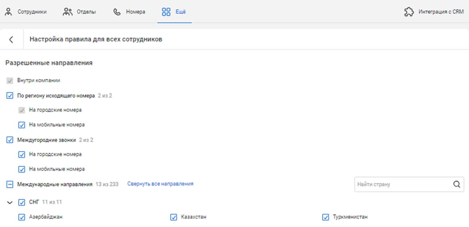 - Выбрать направления звонков, которые будут доступны клиенту: