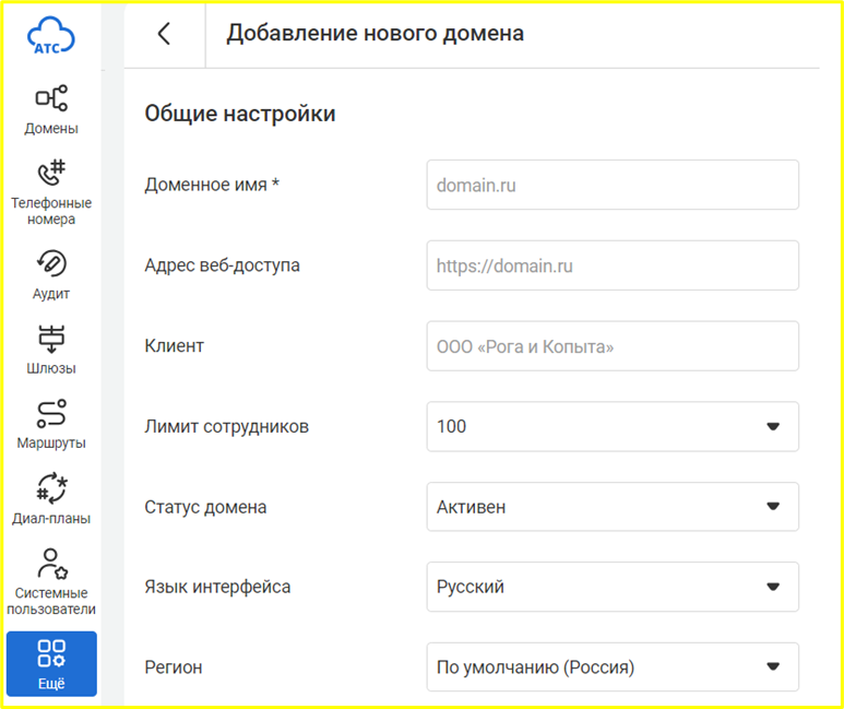 - Доменное имя — полное доменное имя, которое включает уникальные имя АТС. Например: client.pbx.company.ru. Уникальное имя клиента должно соответствовать правилам формирования FQDN (полного имени домена) и устанавливаться на этапе создания.