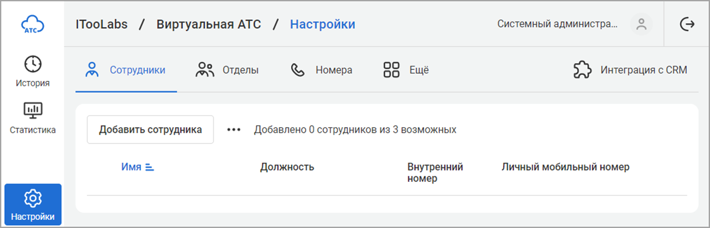 - Лимит сотрудников — максимальное количество сотрудников, которых можно создать в АТС. Можно выбрать значение из списка или ввести вручную. Значение без ограничения позволяет создать максимальное количество сотрудников.