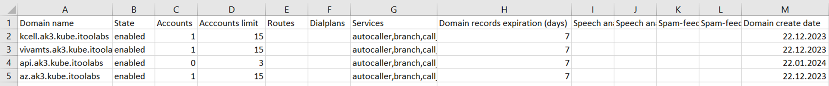 В отчете по каждому домену можно посмотреть его состояние, количество и лимит учетных записей, к каким маршрутам и диал-планам подключен домен, какие сервисы на нем включены, какой срок действия домена (в днях), а также более подробную информацию по отдельным сервисам.