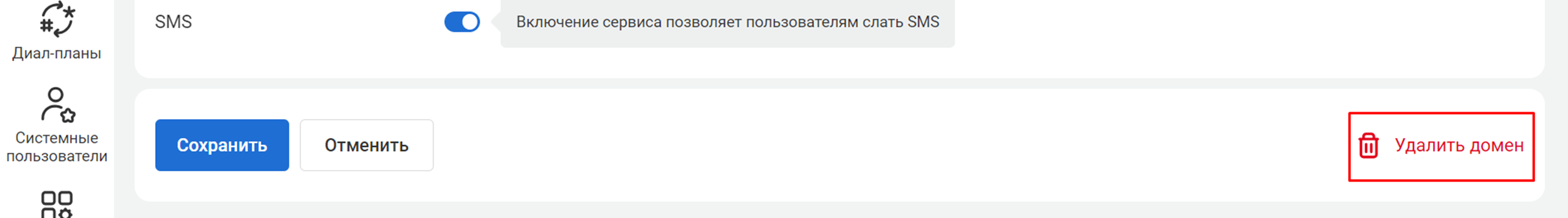1. Нажмите на шестеренку напротив названия домена в общем списке. 2. Откроются настройки домена. В правом нижнем углу страницы нажмите на кнопку Удалить домен.