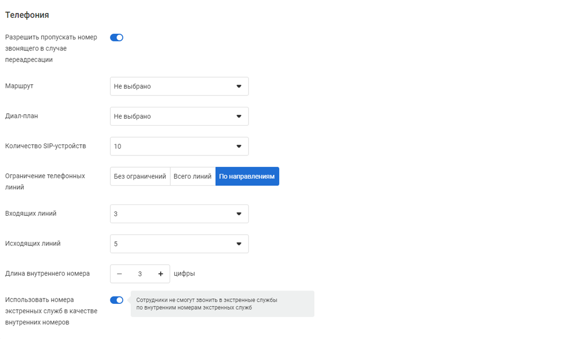 - Использовать номера экстренных служб в качестве коротких номеров сотрудников — указывает, может ли АТС содержать внутренние номера, которые пересекаются с номерами экстренных служб (01, 03, 112, 122 и т. п.).