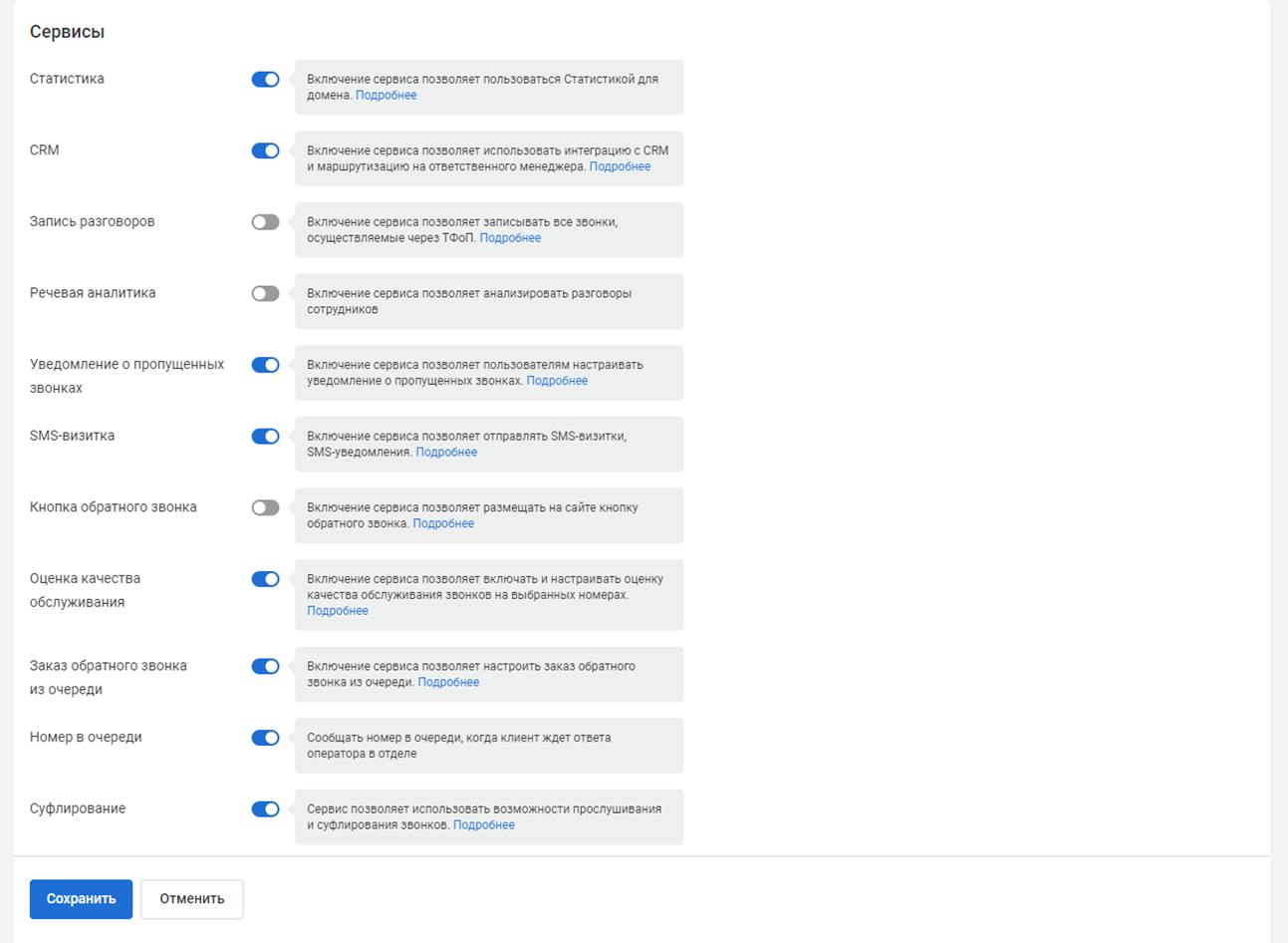 Чтобы включить/отключить сервис, переведите переключатель в нужное положение. Если сервис отключен, то в клиентском интерфейсе соответствующая функциональность будет недоступна.
