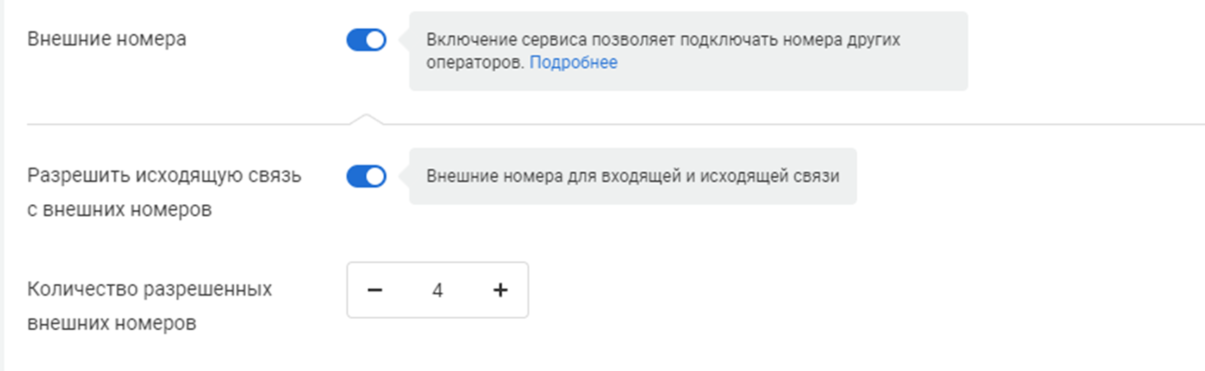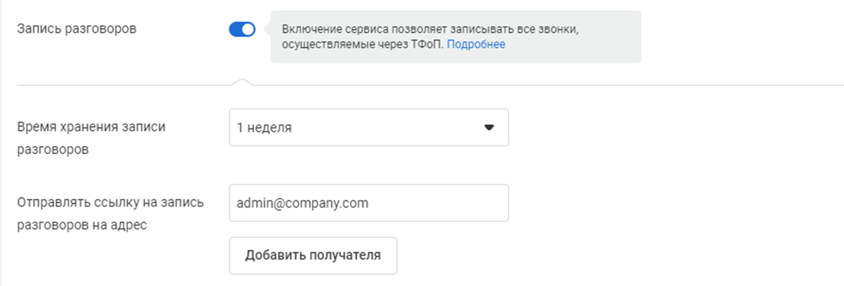 - Запись разговоров — запись входящих и исходящих вызовов. При включении сервиса доступно дополнительное поле: