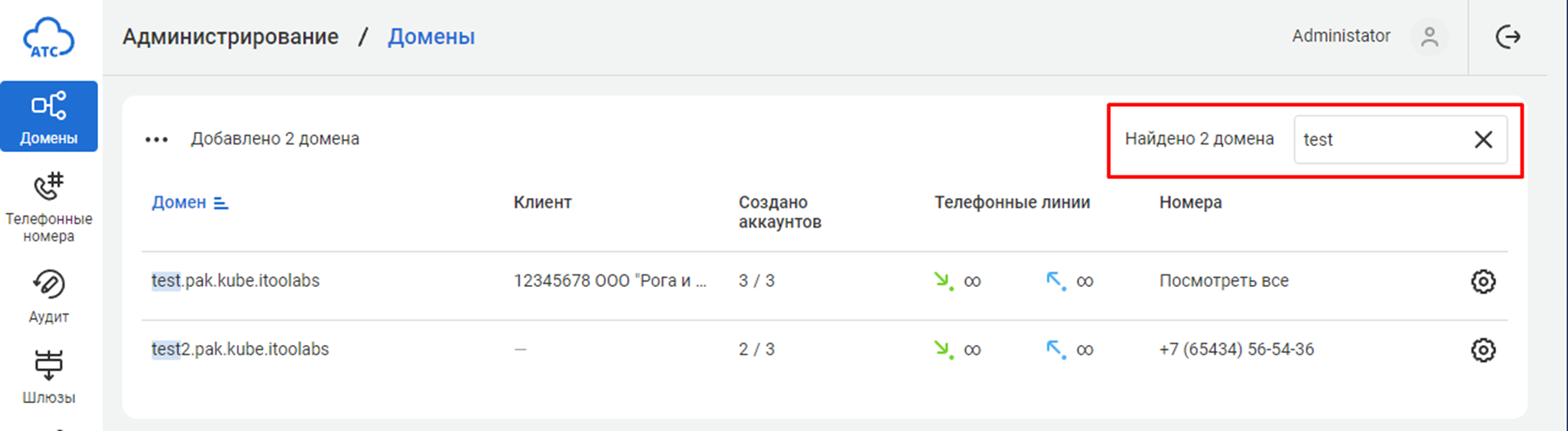 В строке поиска введите часть доменного имени, телефона или текста из поля Клиент и нажмите Enter. В списке отобразятся только те домены, в названиях которых есть искомый фрагмент.
