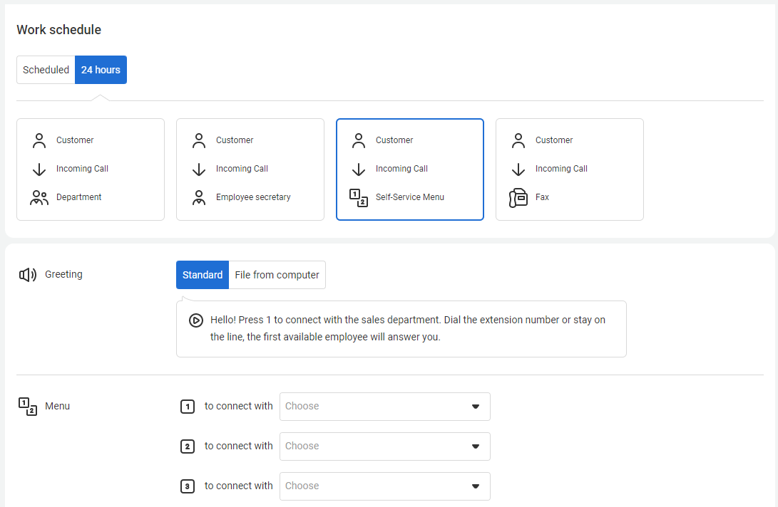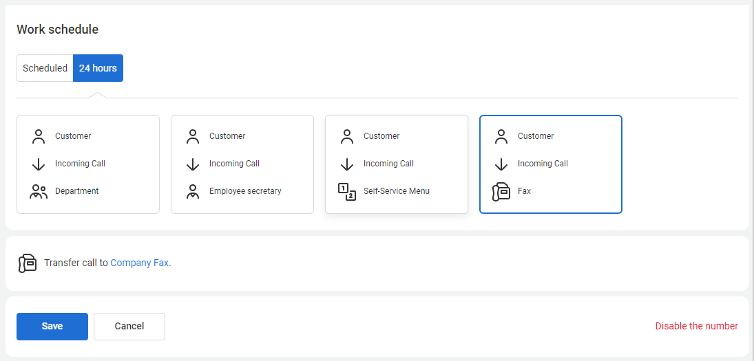 To connect faxing to a special number permanently, go to the Numbers section. Select the 24 hours option and configure one of the numbers to work with the fax.