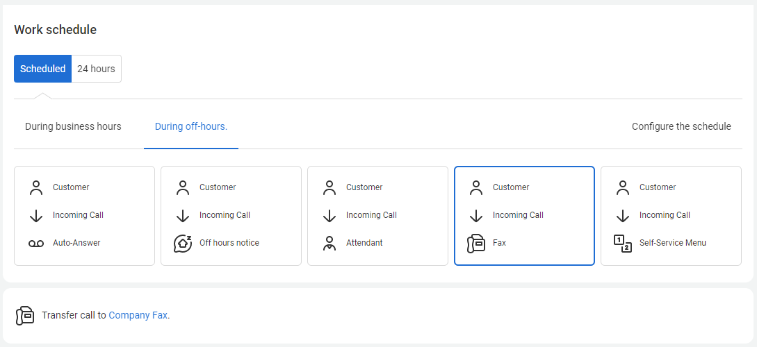 Select the Scheduled mode in the Numbers section and choose to forward incoming calls to the fax in the During off-hours tab.