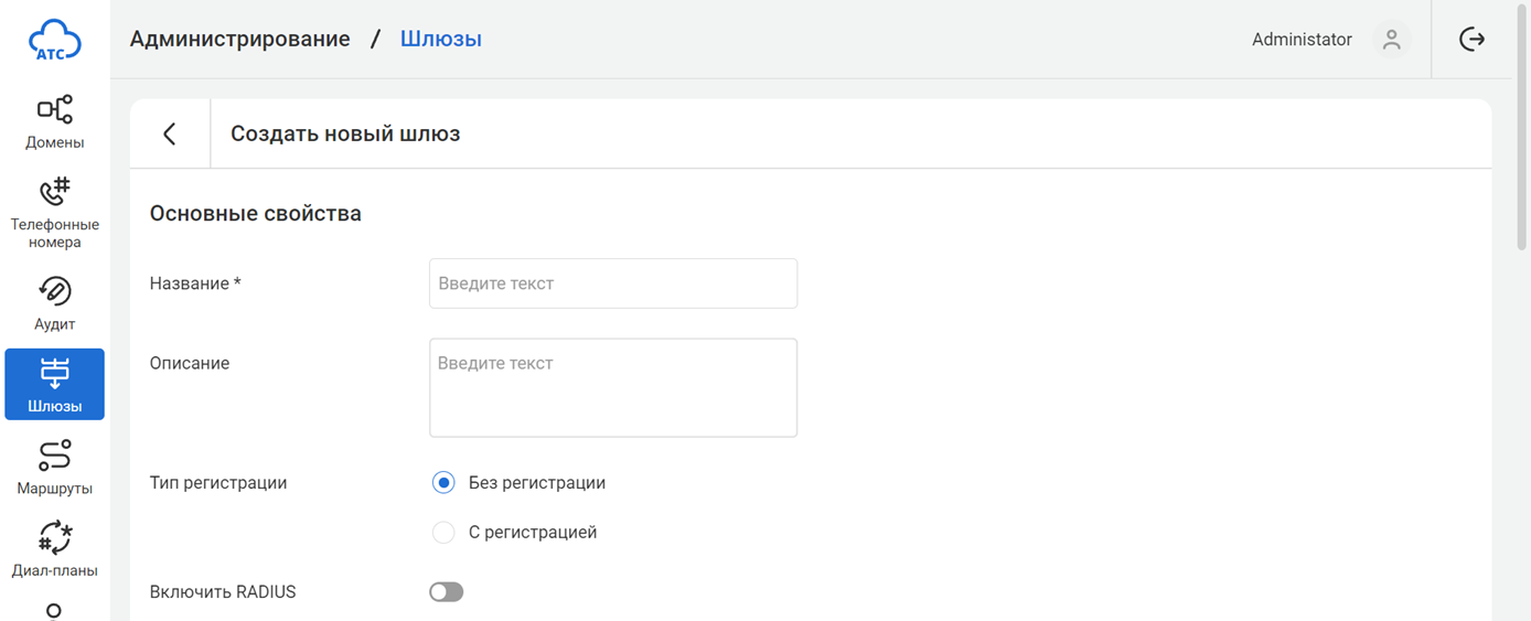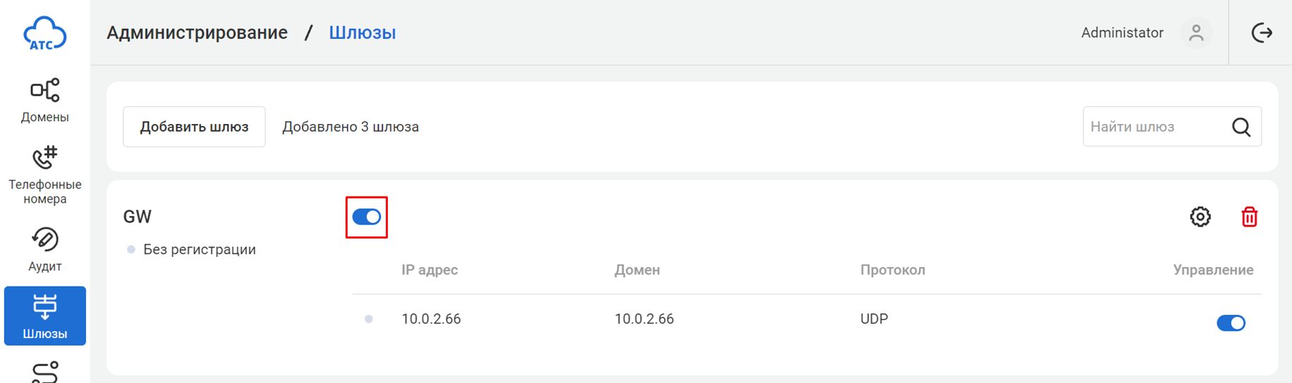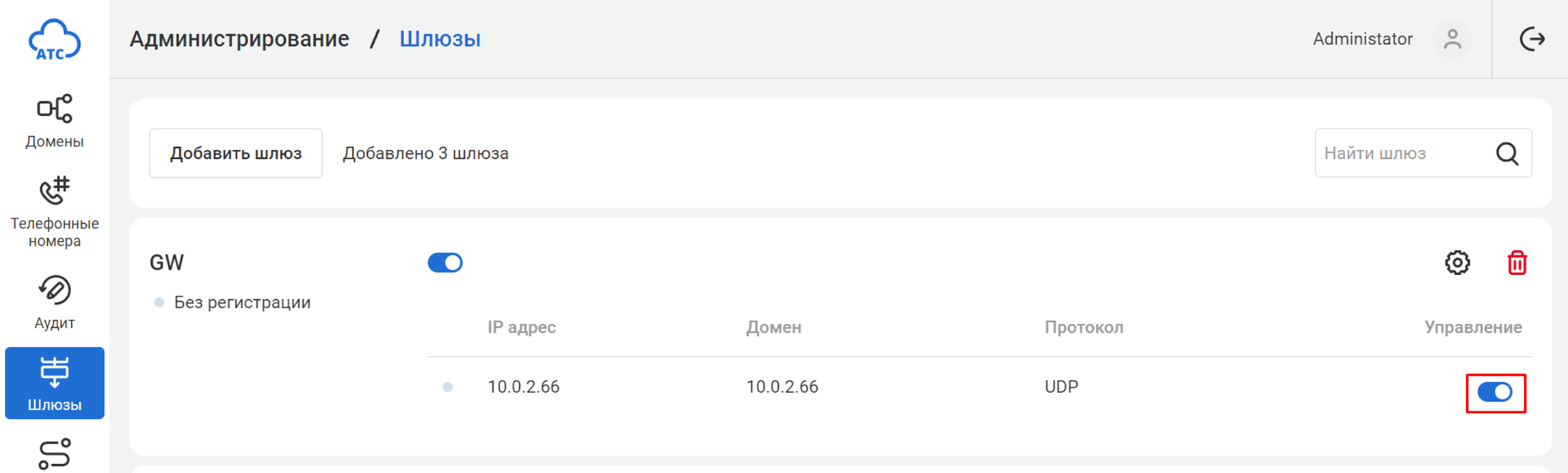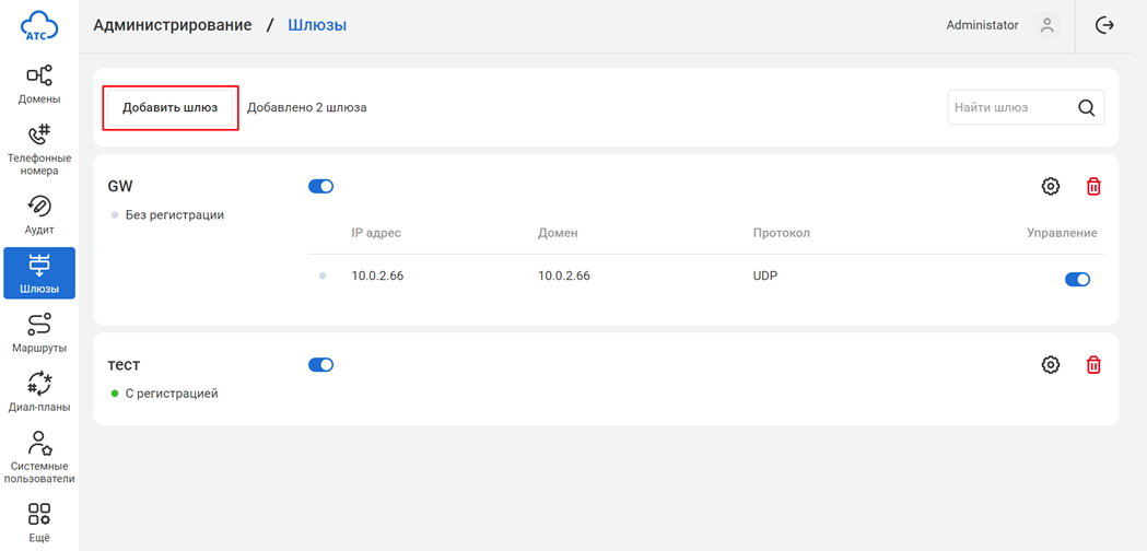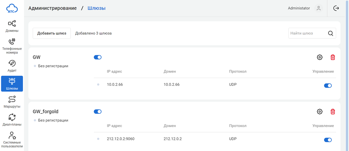 Раздел Шлюзы содержит список оборудования оператора, с которого поступают и на которое отправляются внешние вызовы в сети и из сетей ТфОП или GSM. Каждый шлюз содержит параметры подключения и правила передачи номеров в обоих направлениях.