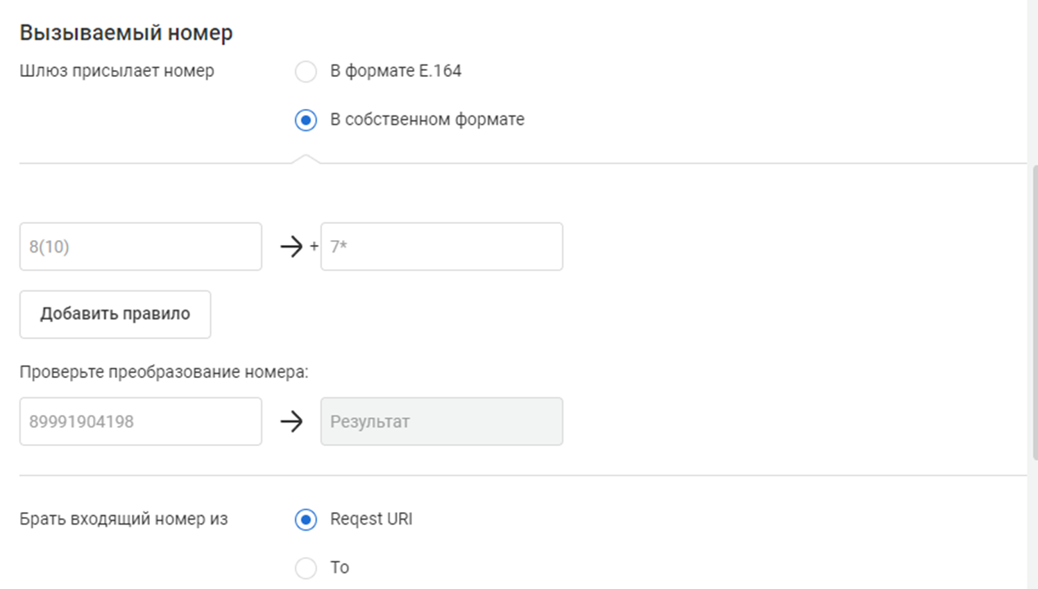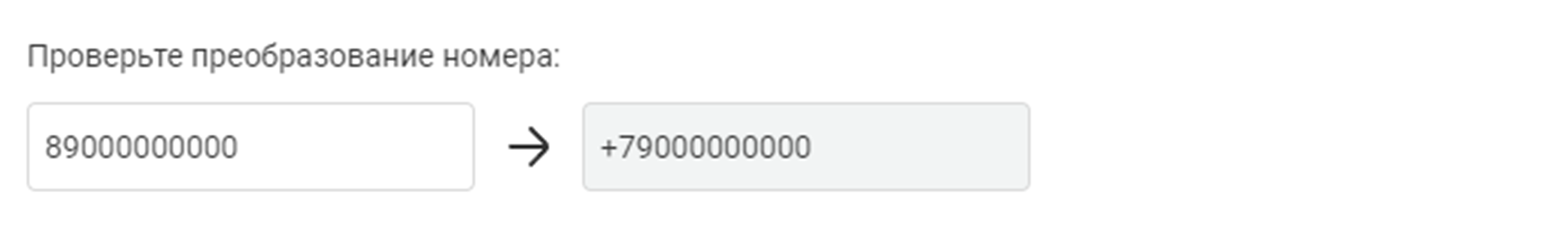 Например, номер, с которого поступает входящий вызов, имеет формат 8XXXXXXXXXX. Платформа воспринимает номера в формате 7XXXXXXXXXX. Для трансляции номера необходимо задать правило.