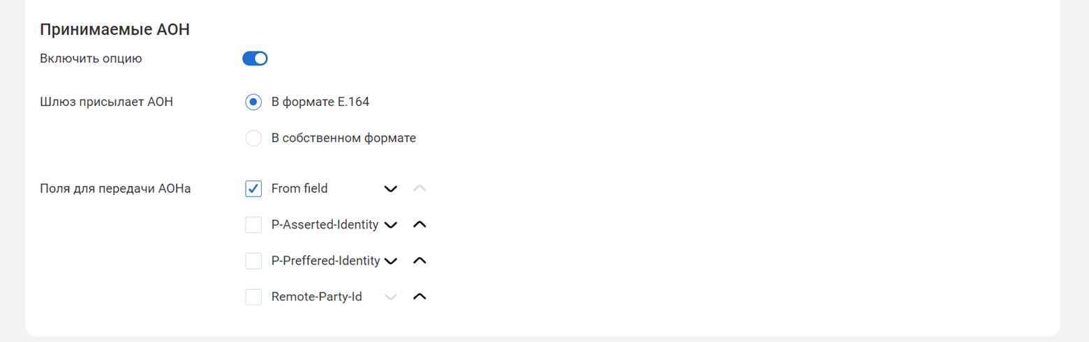 Если необходимо обработать присылаемый шлюзом операторов АОН, включите опцию Принимаемое AOH.