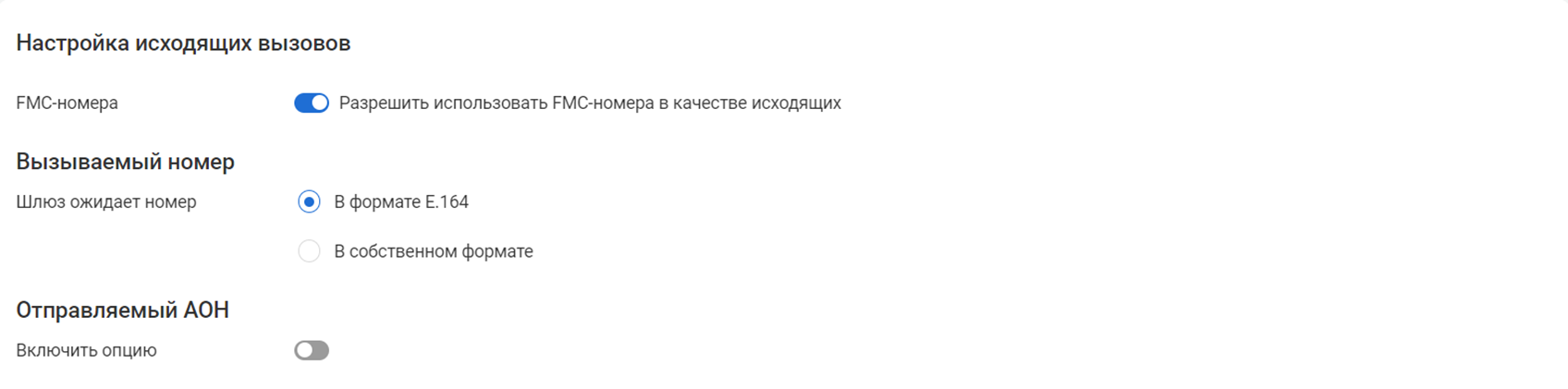 1. Чтобы использовать FMC-номера в качестве исходящих, переведите переключатель в включенное положение. Если этого не сделать, то FMC-номера, которые будут подключены к этому шлюзу, нельзя будет использовать в качестве основных, персональных и региональных исходящих. Они не будут отображаться в разделе «Настройки» — «Задачи — исходящие номера» в личном кабинете клиента.