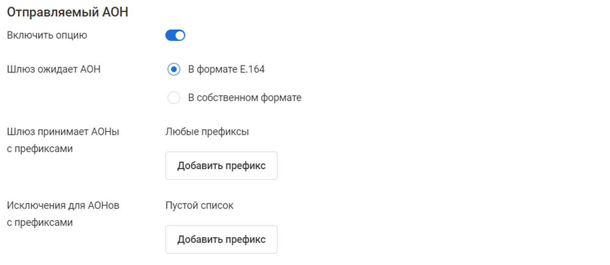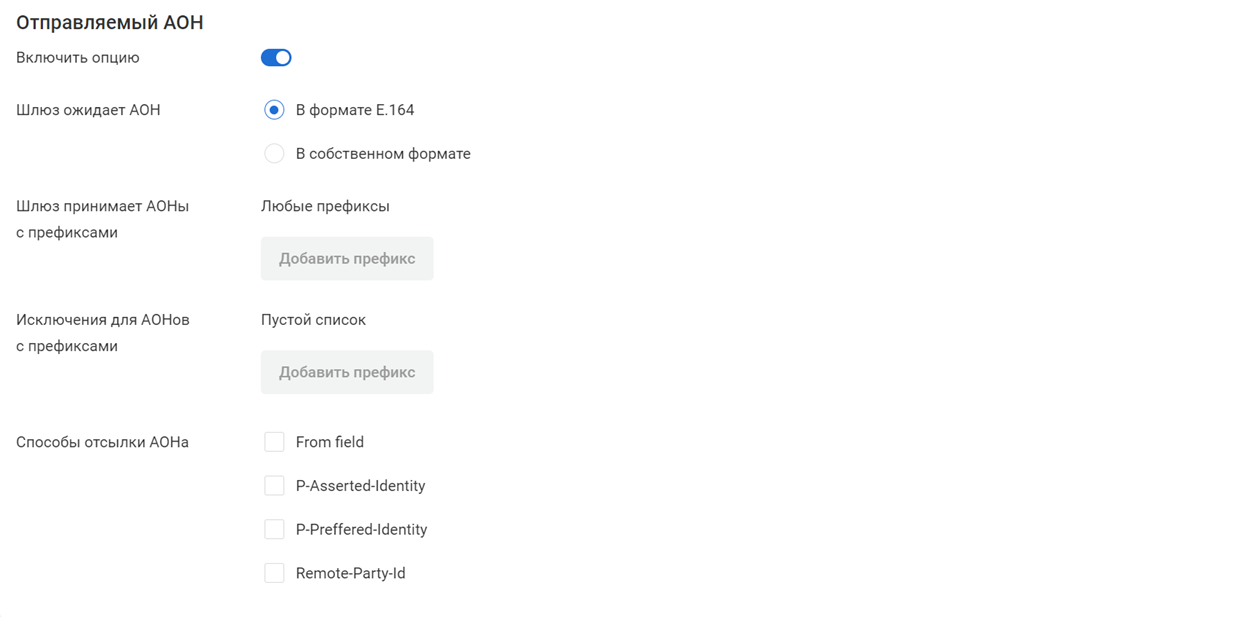 Если шлюз оператора ожидает АОН, в блоке Отправляемый АОН включите опцию.