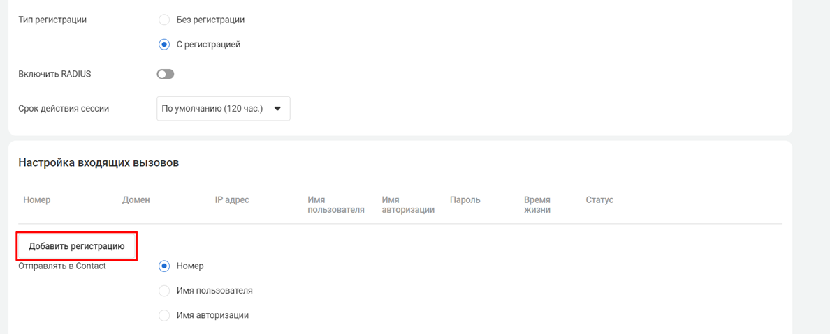 1. В блоке Настройка входящих вызовов нажмите на кнопку Добавить регистрацию.