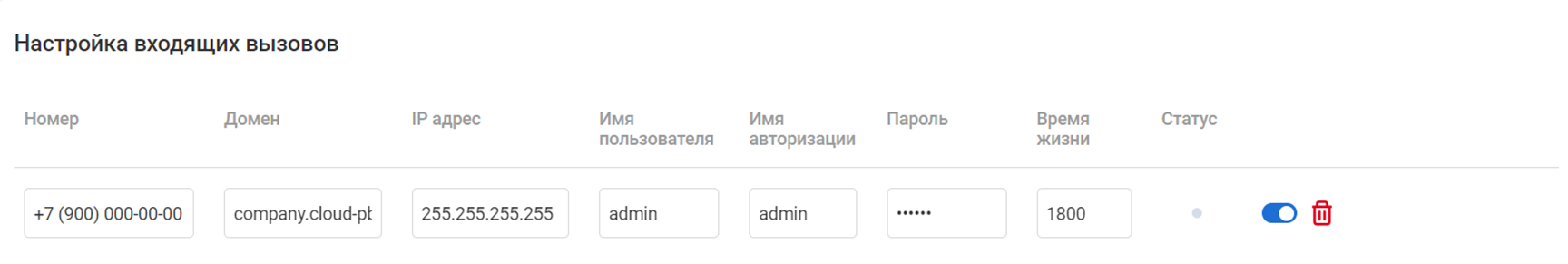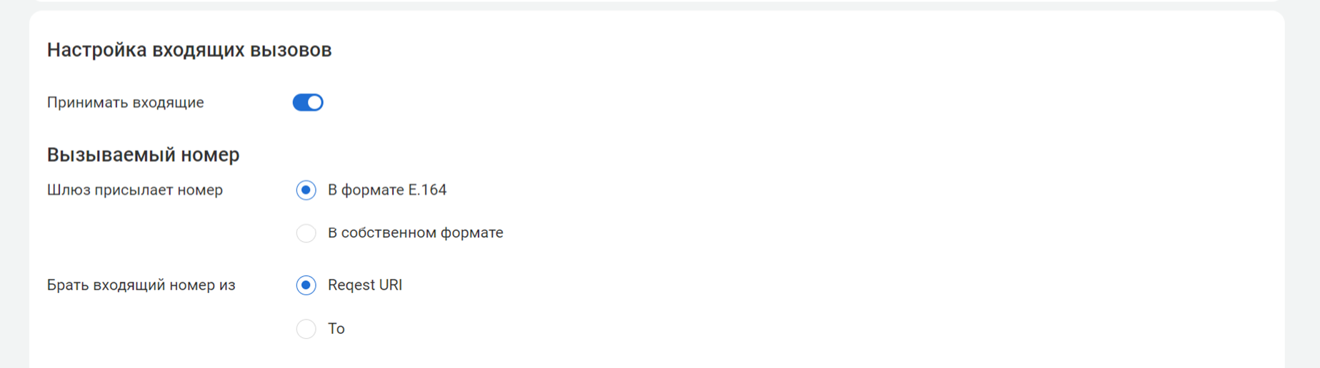 1. В блоке Настройка входящих вызовов включите опцию Принимать входящие. Тогда у вас появятся настройки вызываемого номера и принимаемого AOH.