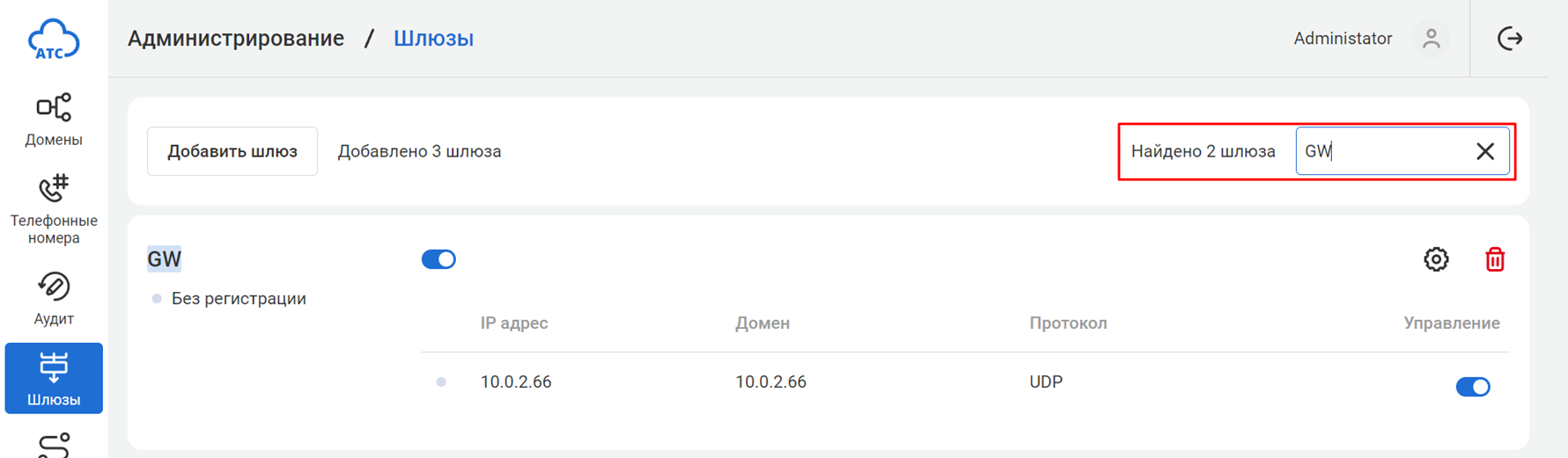 Прямо из таблицы шлюзов можно искать, блокировать и удалять шлюз, давать доступ к управлению шлюзом другим сотрудникам.