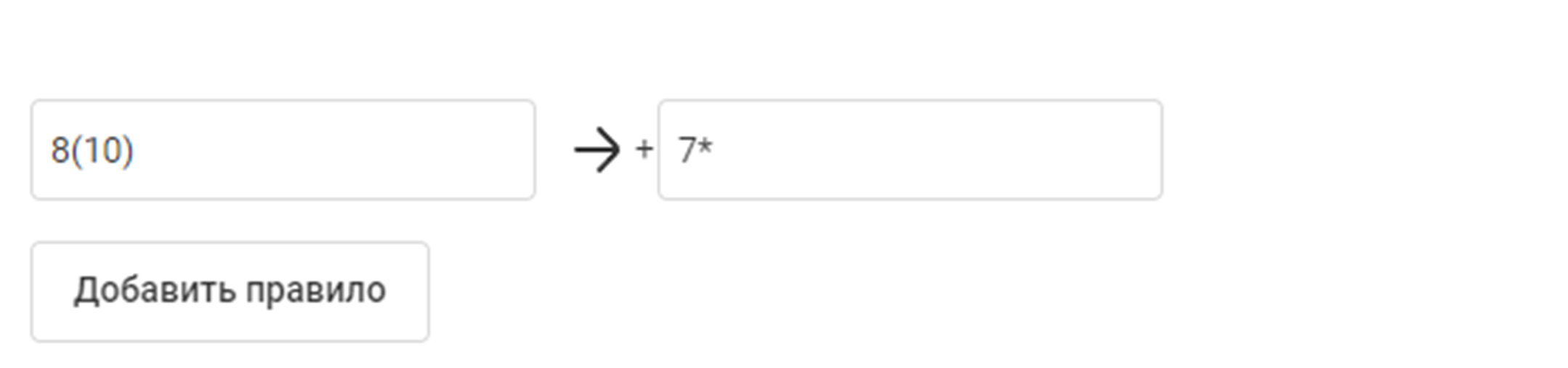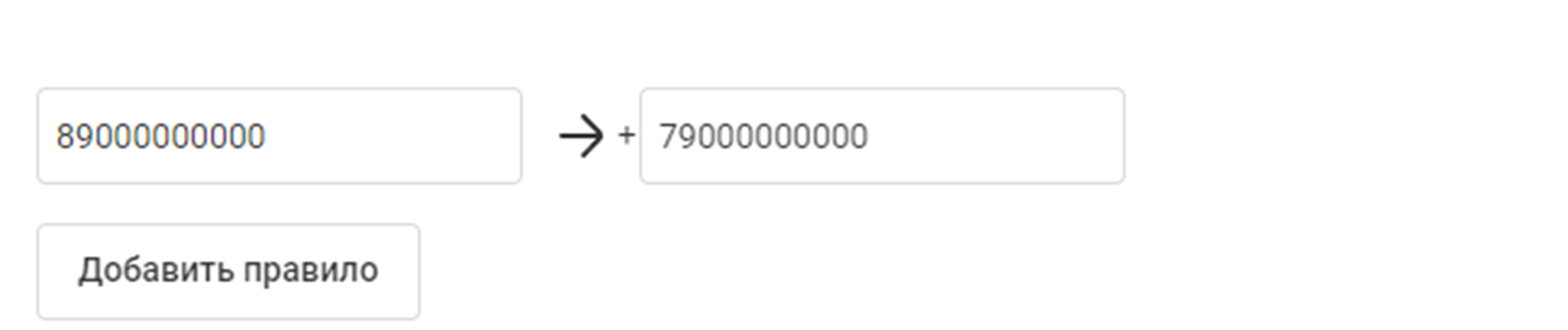 Согласно этому правилу, все номера, начинающиеся с 8 и имеющие после него 10 цифр, будут транслироваться в номера, начинающиеся с +7 и имеющие любые 10 цифр исходного номера.