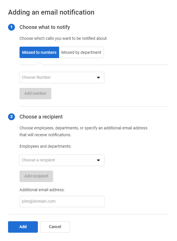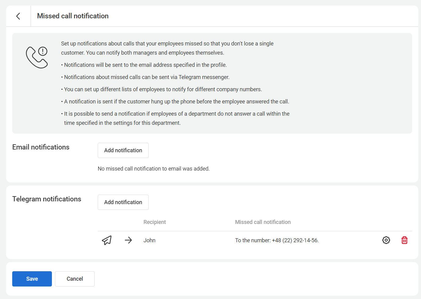 You can configure which employees will receive the notifications. To set up notifications via email and SMS, you can either specify an employee or a custom phone number or email.