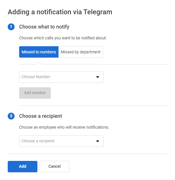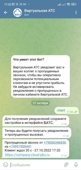 To configure notifications in Telegram, specify an employee who will receive the notifications. For each such employee, a special link will be generated. The employee should follow the link and initiate the cloud PBX information bot.