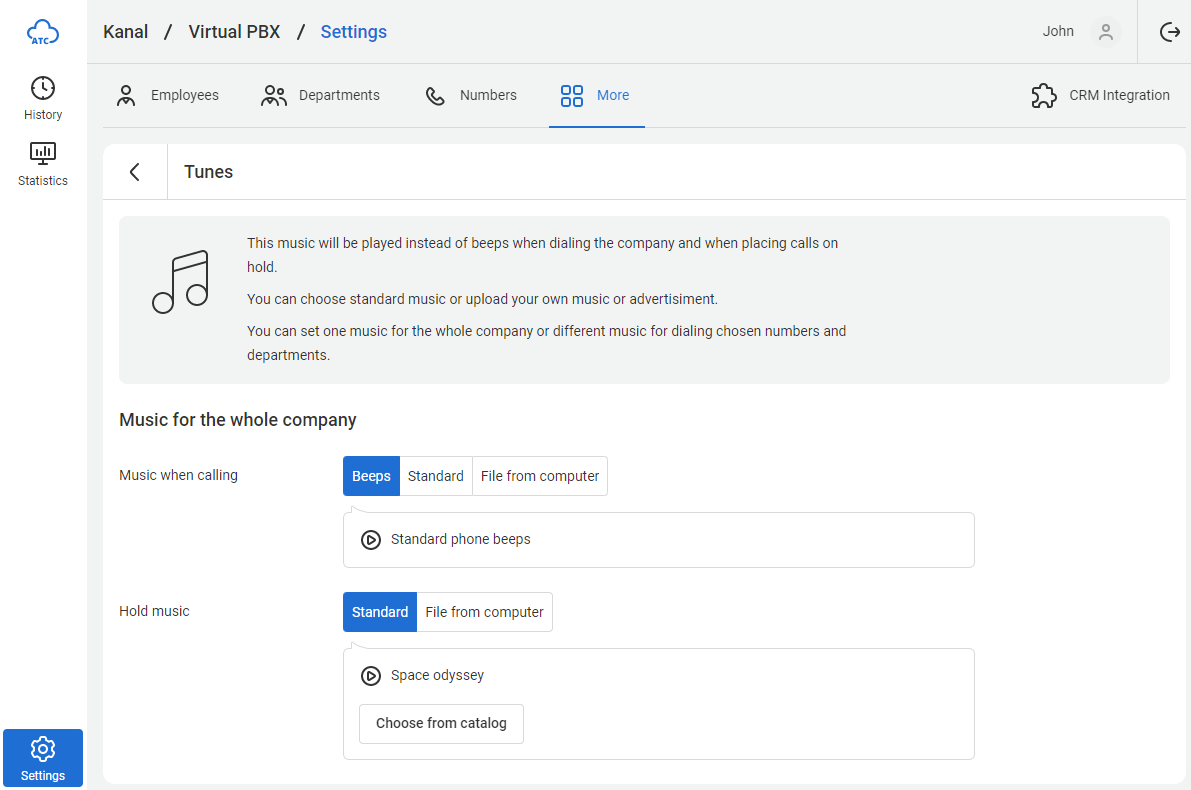 In the catalog of standard melodies, you can choose the music that will play when calling company numbers and departments. The cloud PBX offers 7 standard melodies now.