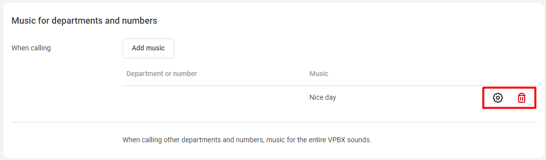 To change the music for a department, click the gear icon located to the right of the department name and music. To remove the music settings, click the trash bin icon.