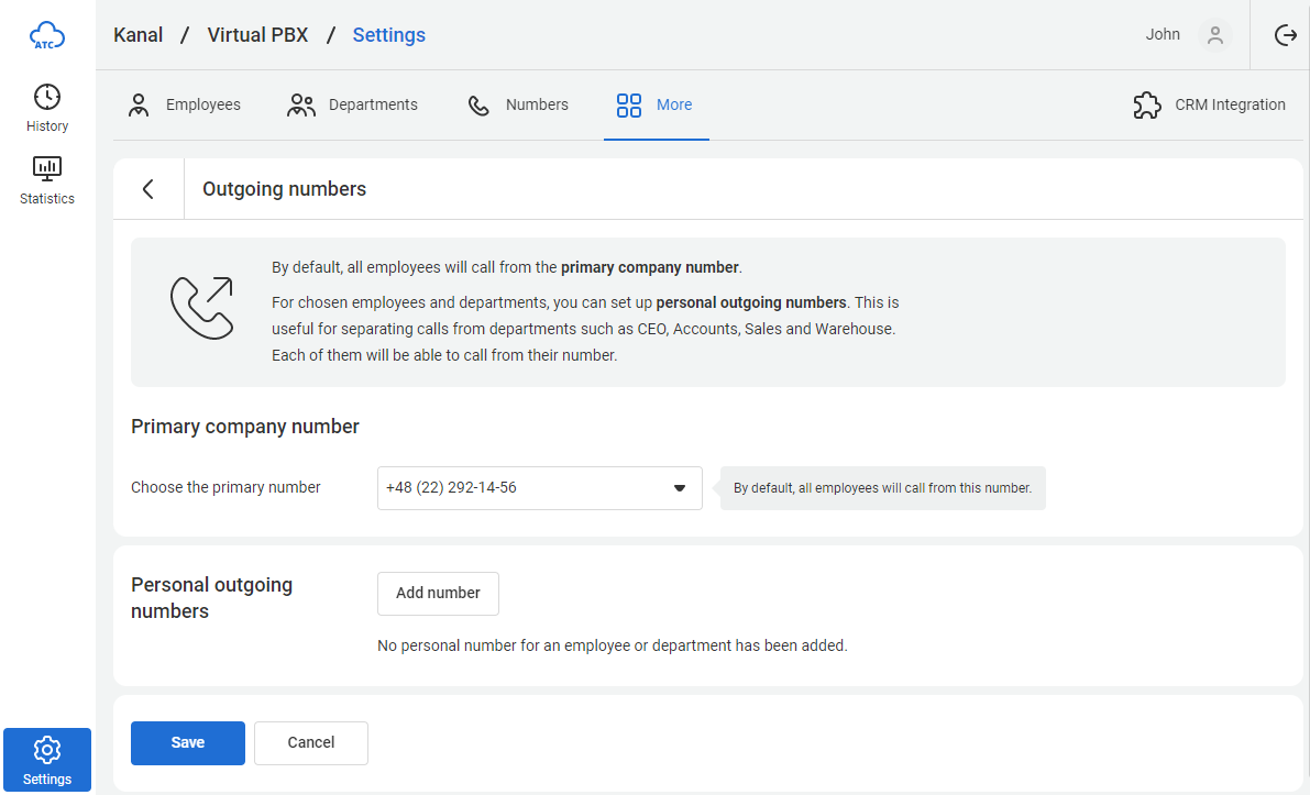 To manage outgoing numbers, go to the Settings section, select More, and choose Outgoing numbers.