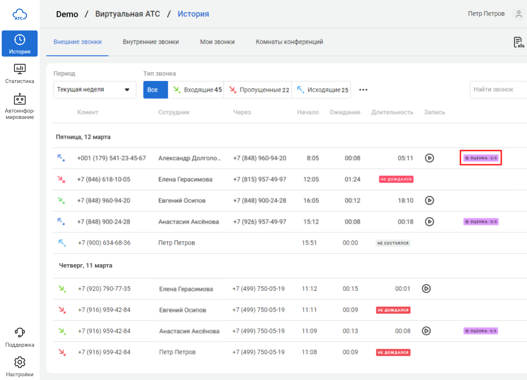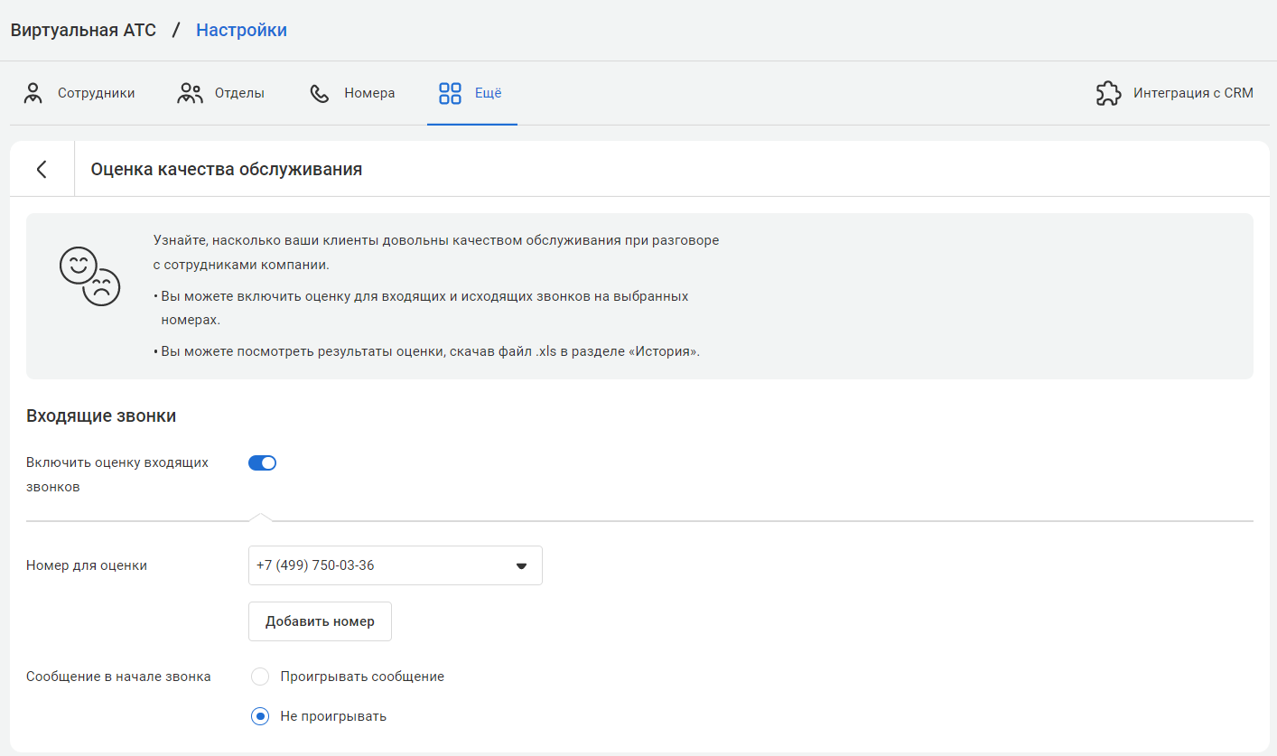 The cloud PBX automatically transfers call assessments to amoCRM and Bitrix24. Besides, you can retrieve ratings through a request to the cloud PBX's REST API.