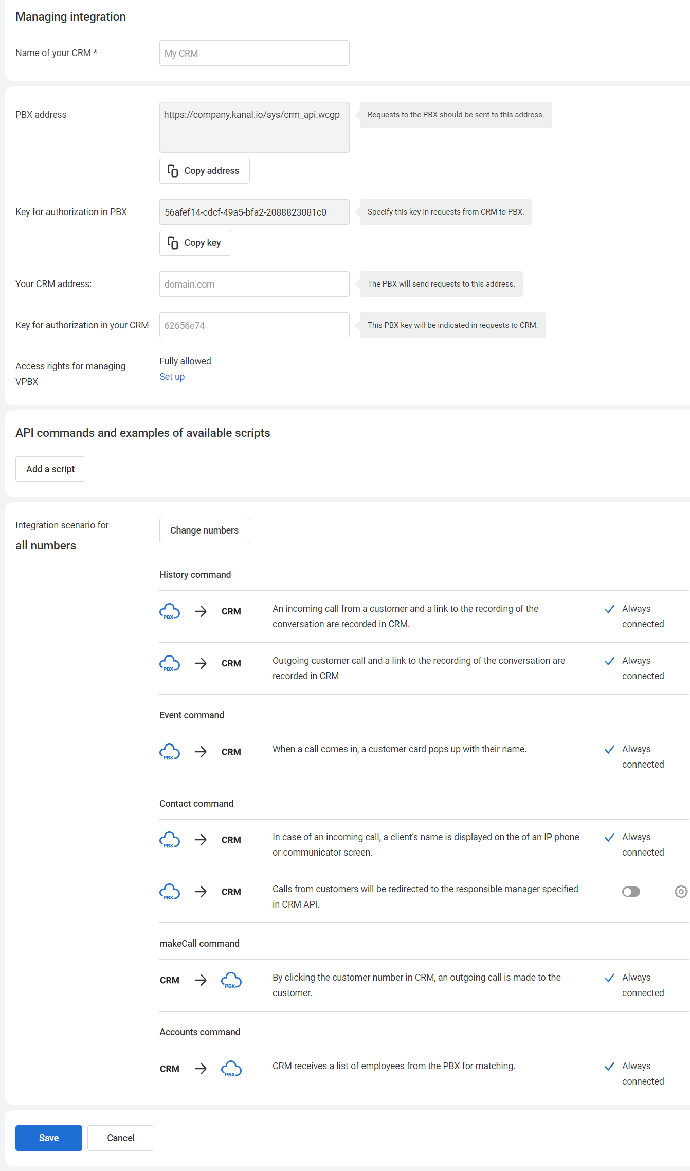 If you have your CRM system, you can integrate with it independently using the REST API. You can download REST API documentation here.