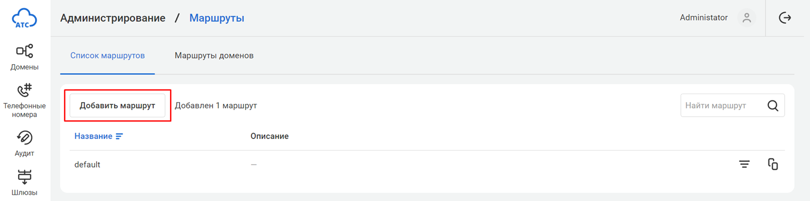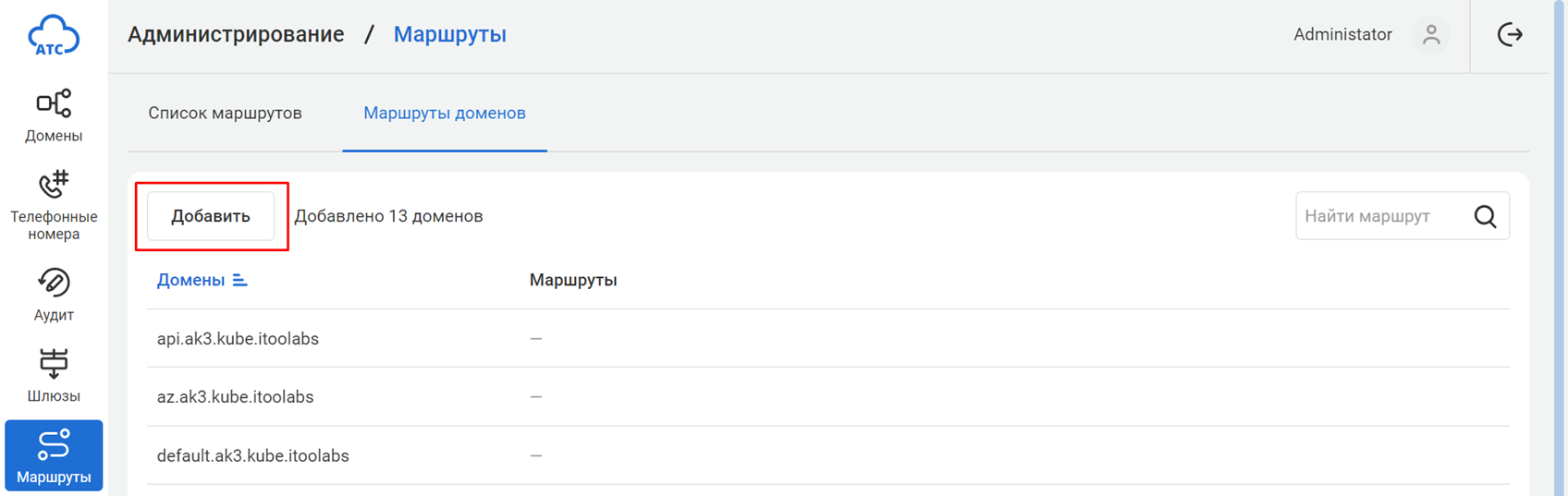 1. На вкладке Маршруты домена нажмите кнопку Добавить.