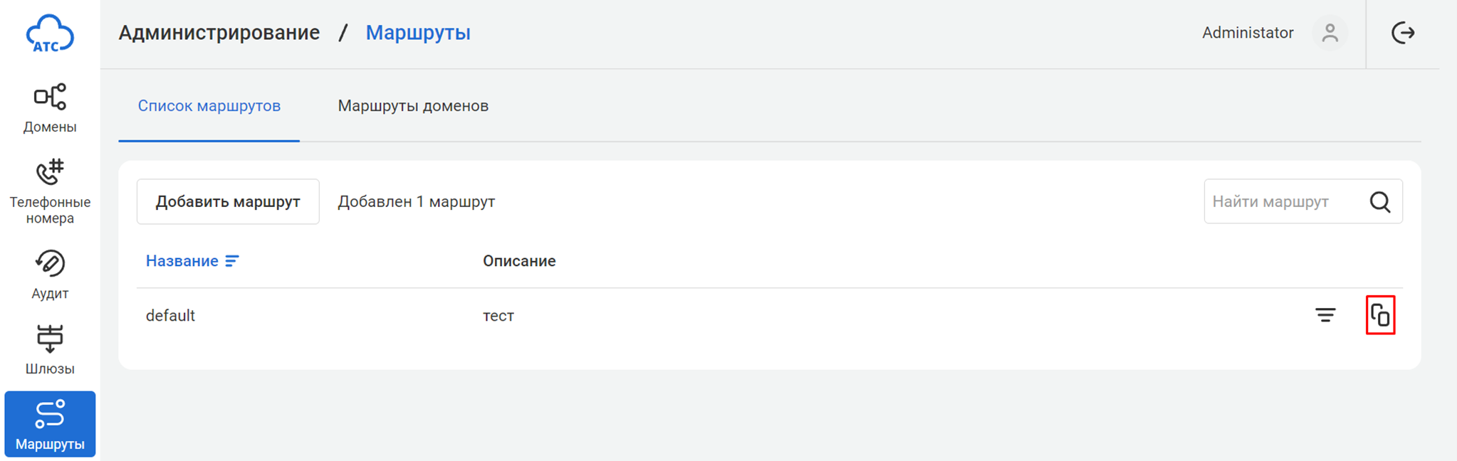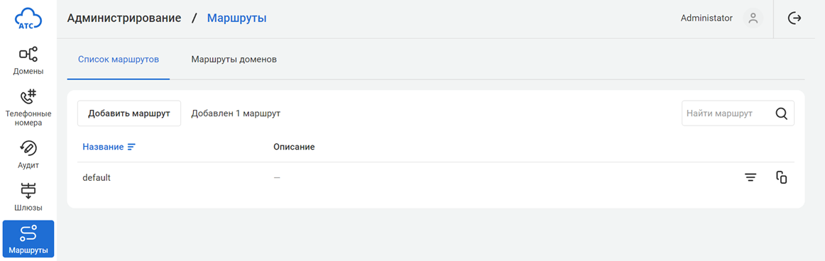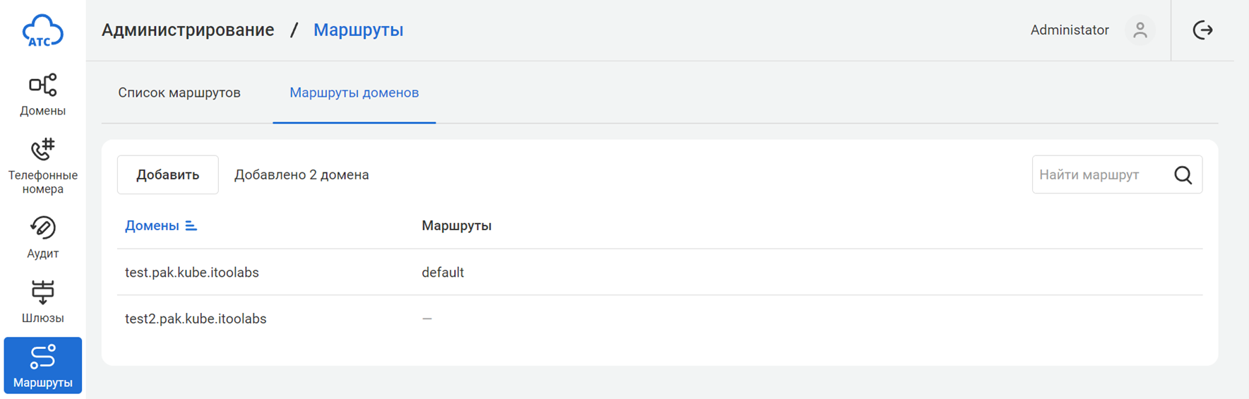 2. Откроется раздел Домены, в списке отобразятся домены, связанные с выбранным маршрутом.