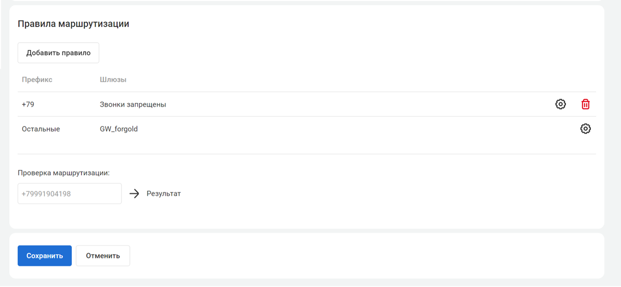 По умолчанию в таблице содержится строка с префиксом Остальные. Она означает, что вызовы с номеров, которые не удовлетворяют другим правилам (или других правил отсутствует), будут использовать это правило. Удалить его нельзя, в нем можно только настроить шлюзы.