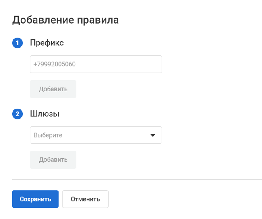 - Префикс — начальный фрагмент телефонного номера (код, часть кода или часть номера с кодом), указывающий направление вызова. Нажмите кнопку Добавить, чтобы добавить префикс. Откроется поле, в которое следует ввести одну или несколько цифр кода. Можно добавлять несколько префиксов. Чтобы удалить префикс, нажмите на крестик.