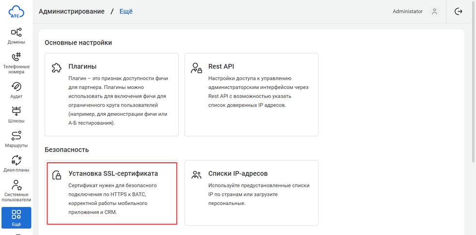 Для установки SSL-сертификата выполните следующие действия: 1. Перейдите в раздел Ещё блок Безопасность и выберите Установка SSL-сертификата.