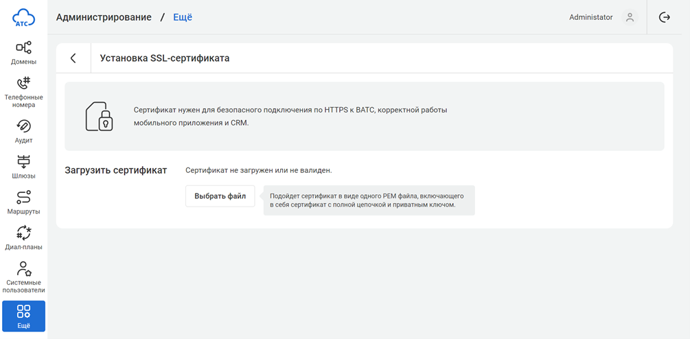 SSL-сертификат необходим для создания безопасного зашифрованного соединения при входе в АТС. Рекомендуется приобретать Wildcard-сертификат вида *.pbx.example.ru, который будет работать для всех адресов в этой зоне.